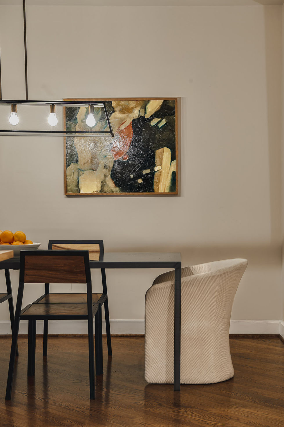 A California-inspired aesthetic meets industrial sophistication in this thoughtfully designed space. Clean vaulted ceilings open the home, while book-matched tiger white oak cabinet doors and a glazed steel hood and island anchor the design with both texture and drama. Crisp dark features are balanced with soft brown highlights, creating warmth and depth that invite a variety of tastes. Every material and finish was selected to bring the client’s vision to life, transforming the space into a modern California dream—organic, approachable, and layered with subtle elegance. The result is a home that feels both dynamic and effortlessly welcoming.