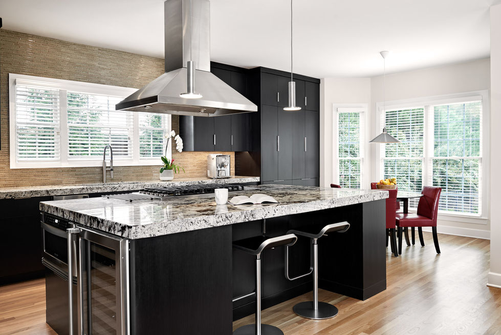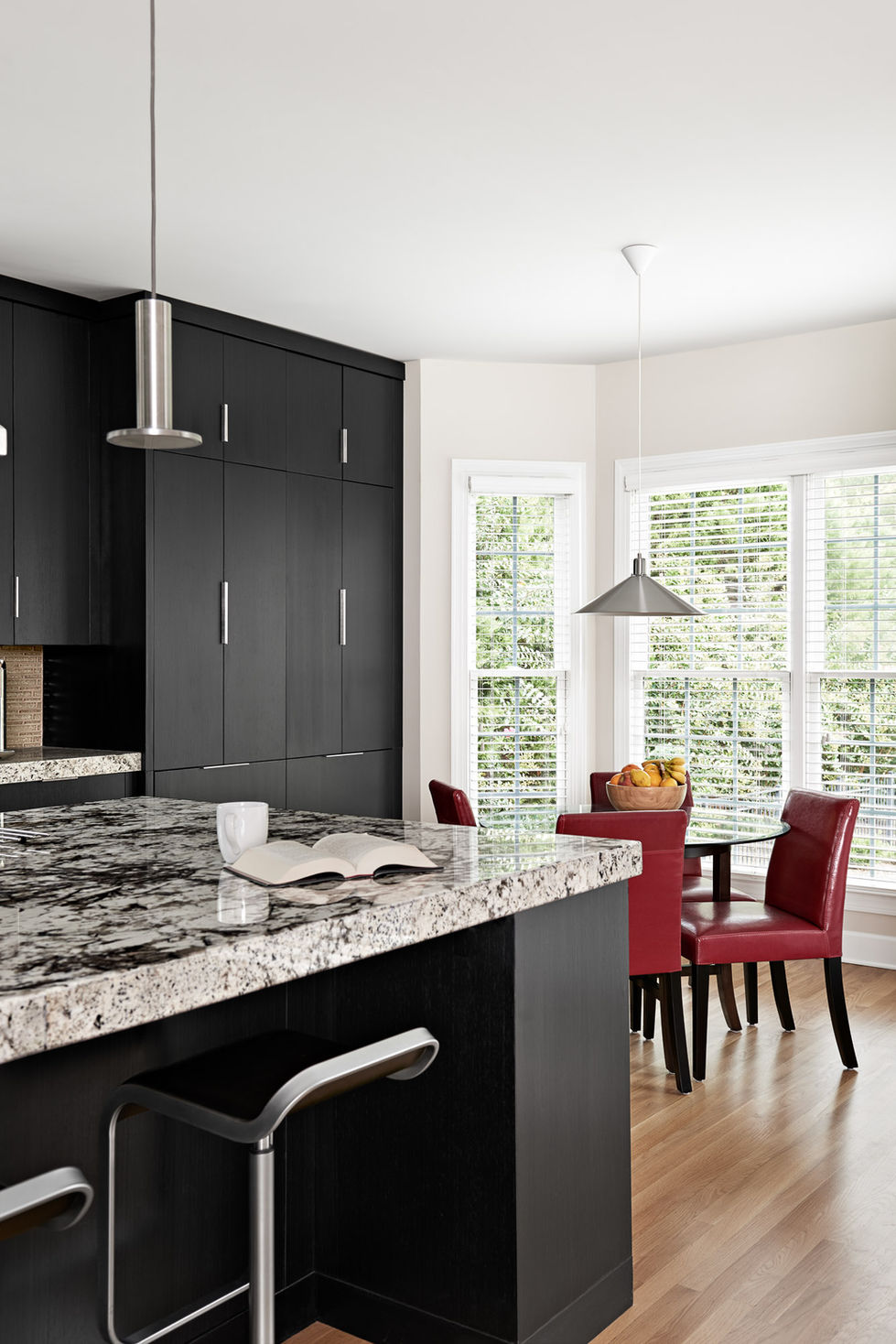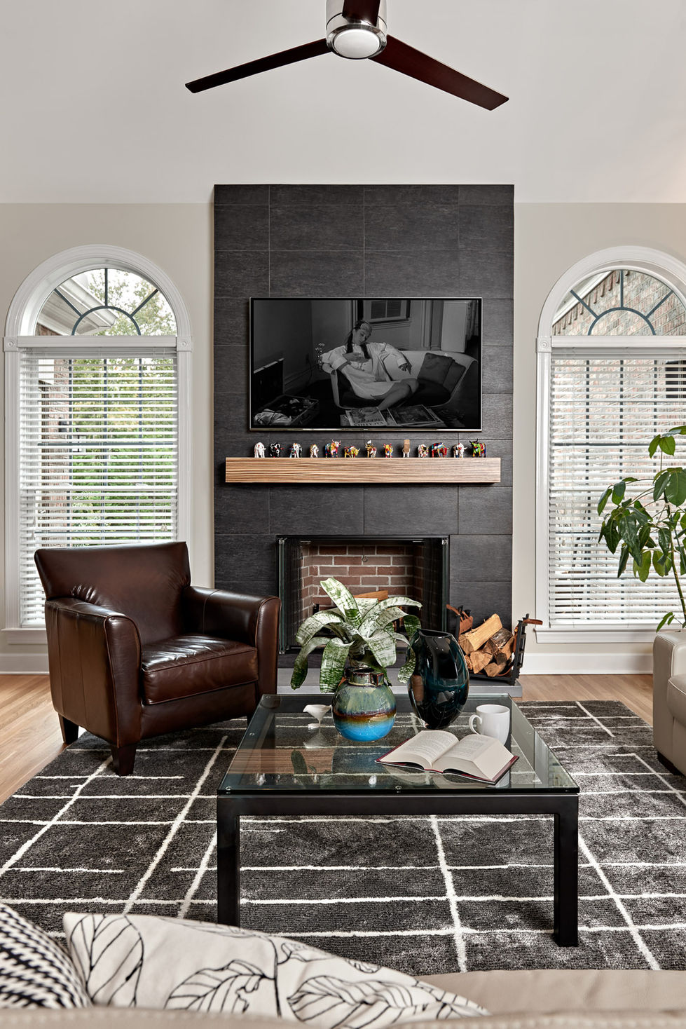 Southern Sophistication transforms the first floor of the home through a thoughtful renovation of the living, dining, and kitchen spaces. Dark cabinetry introduces depth and contrast, allowing the striking countertops to stand out against seamless stainless accents in the lighting, hardware, and appliances. Clean-lined, modern cabinetry keeps the design refined while subtle pops of color add warmth and personality. Every element was selected to balance elegance with contemporary appeal, creating a cohesive environment that feels both polished and inviting. The result is a space that blends modern design with timeless Southern charm, offering sophistication that feels effortless and livable.